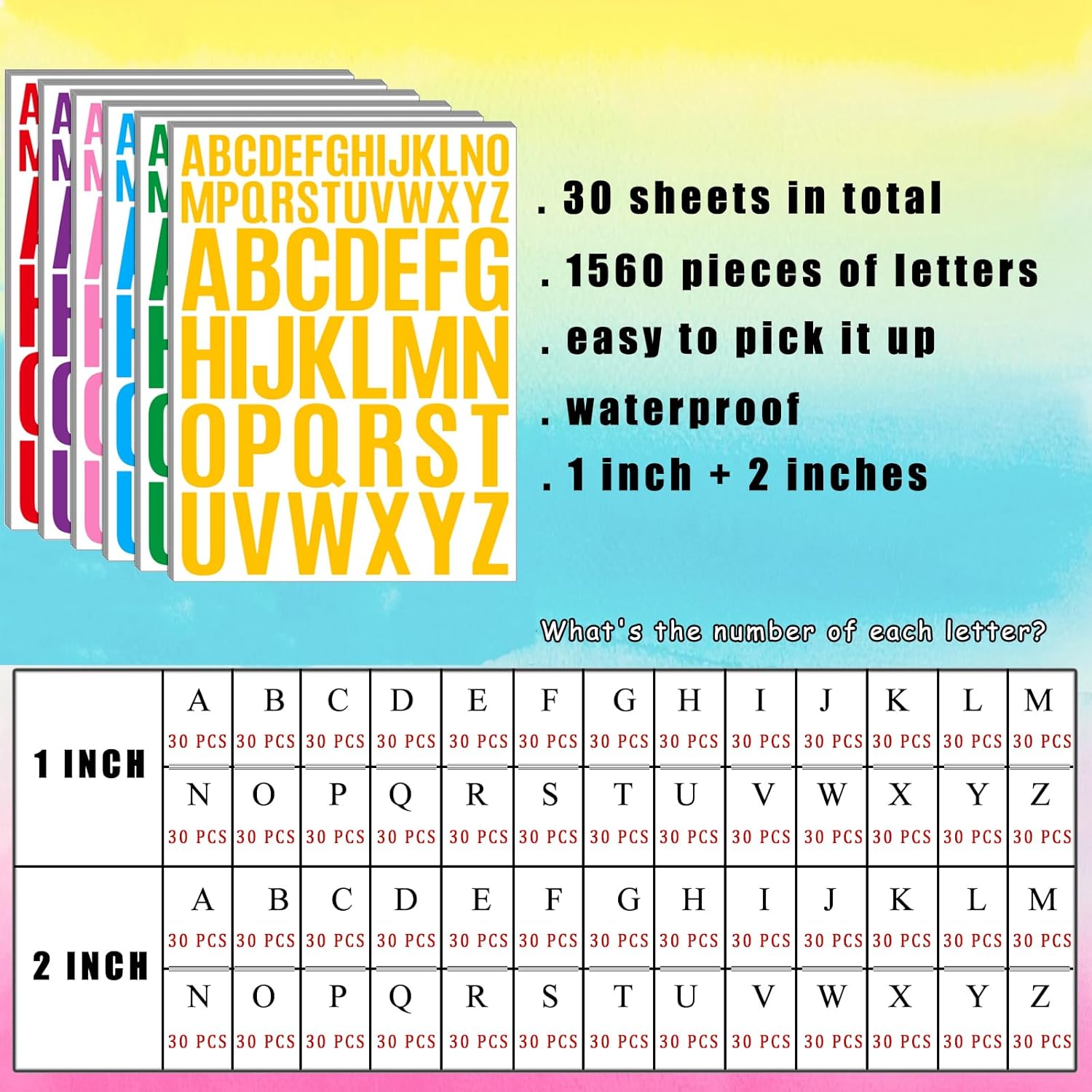 Bemeol Letter Stickers 1560 Pieces 30 Sheets Stick on Vinyl Letters Capital Alphabet Sticker Letter for Craft Bulletin Boards Classroom Home Business Decor(Multicolor,1 Inch,2 Inch)