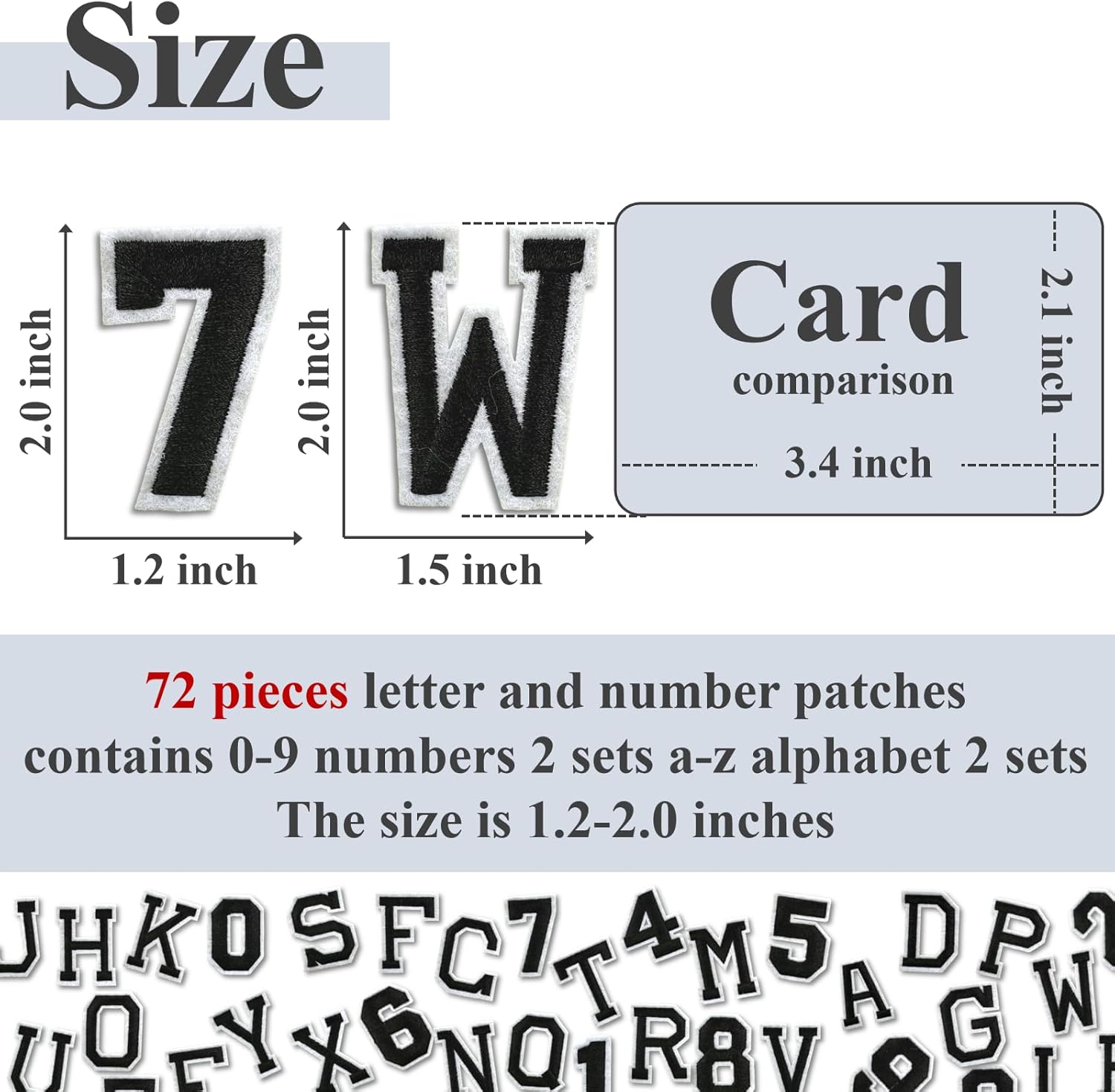 - PRODUCT: 72 pieces letter and number patches, contains a-z alphabet 2 sets, 0-9 numbers 2 sets.