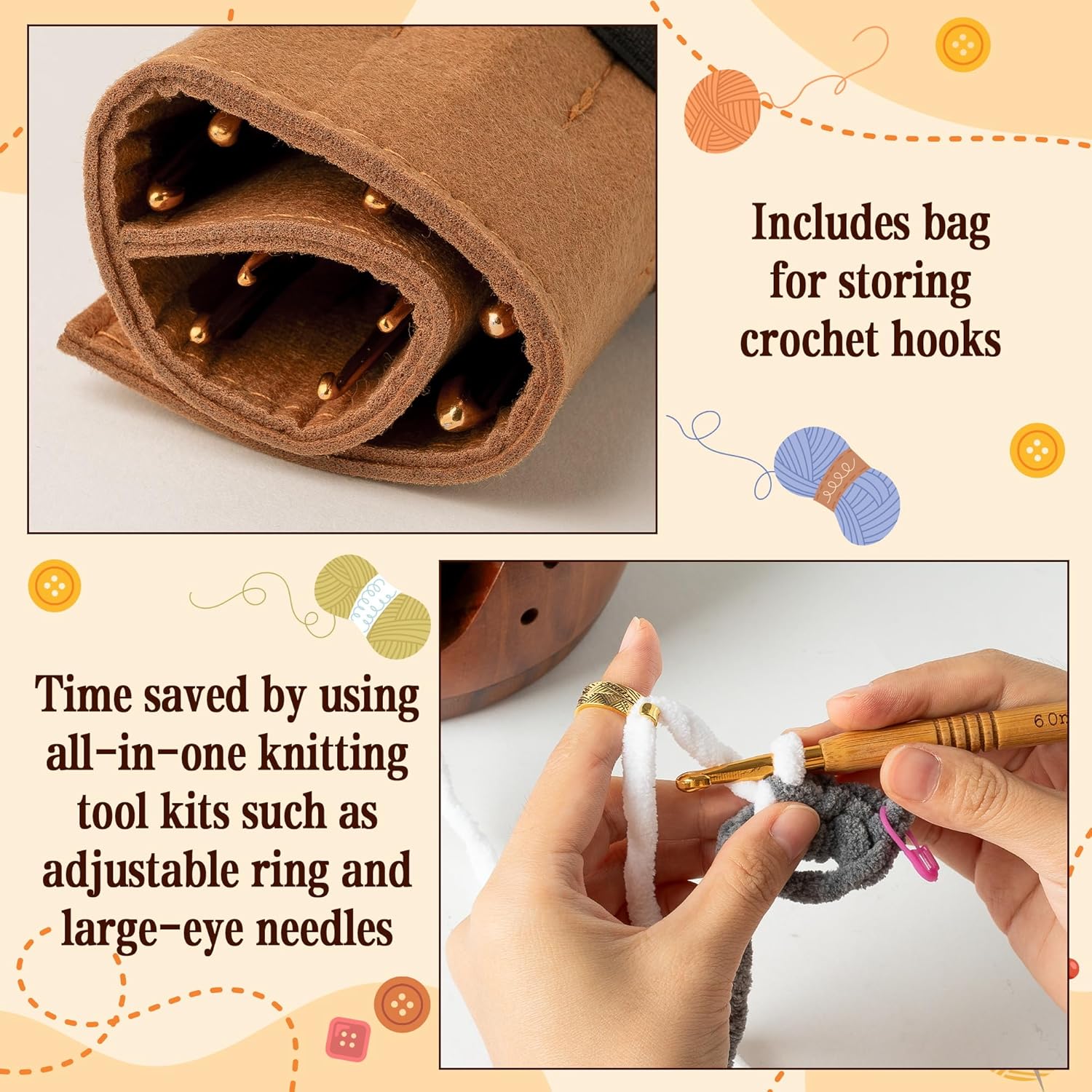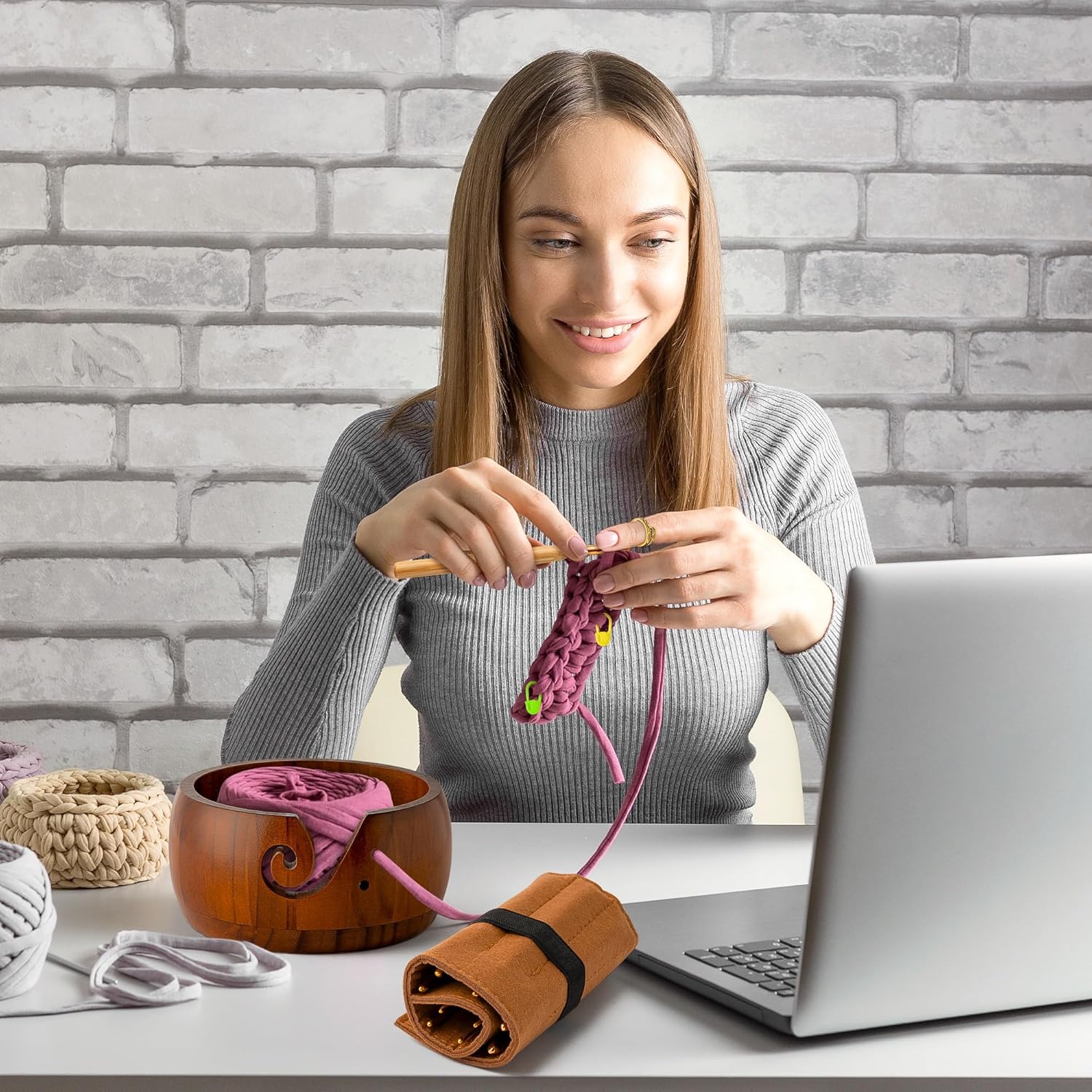 - Crochet Hook Yarn Bowl Set:Our Crochet Wooden Bowl Set comes with 9 sizes of metal crochet hooks, 2 gold crochet tail rings, 10 marker clasps, 6 marker pins, and a felt storage bag. With a complete set of crochet tools, you can easily finish your knitting as you wish.