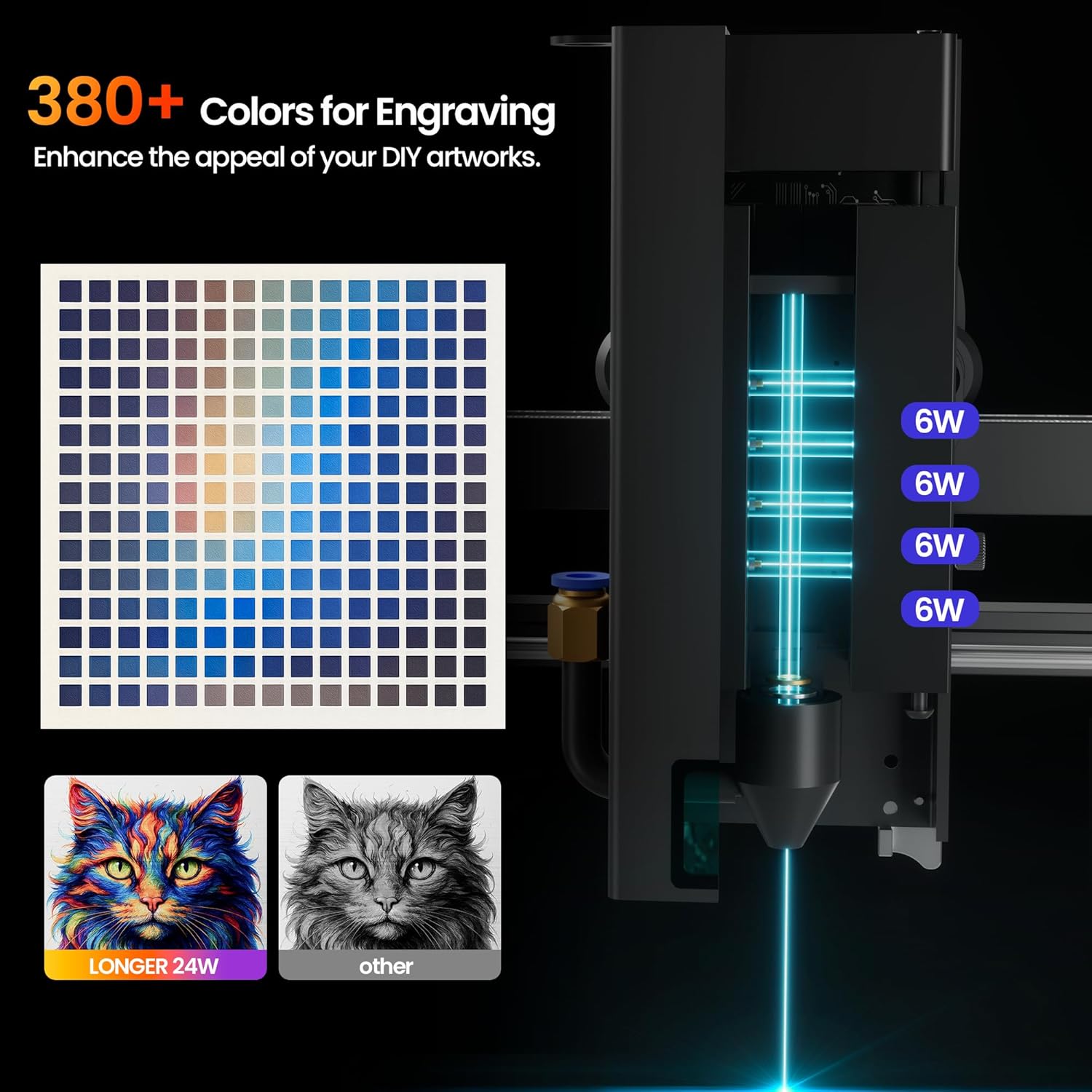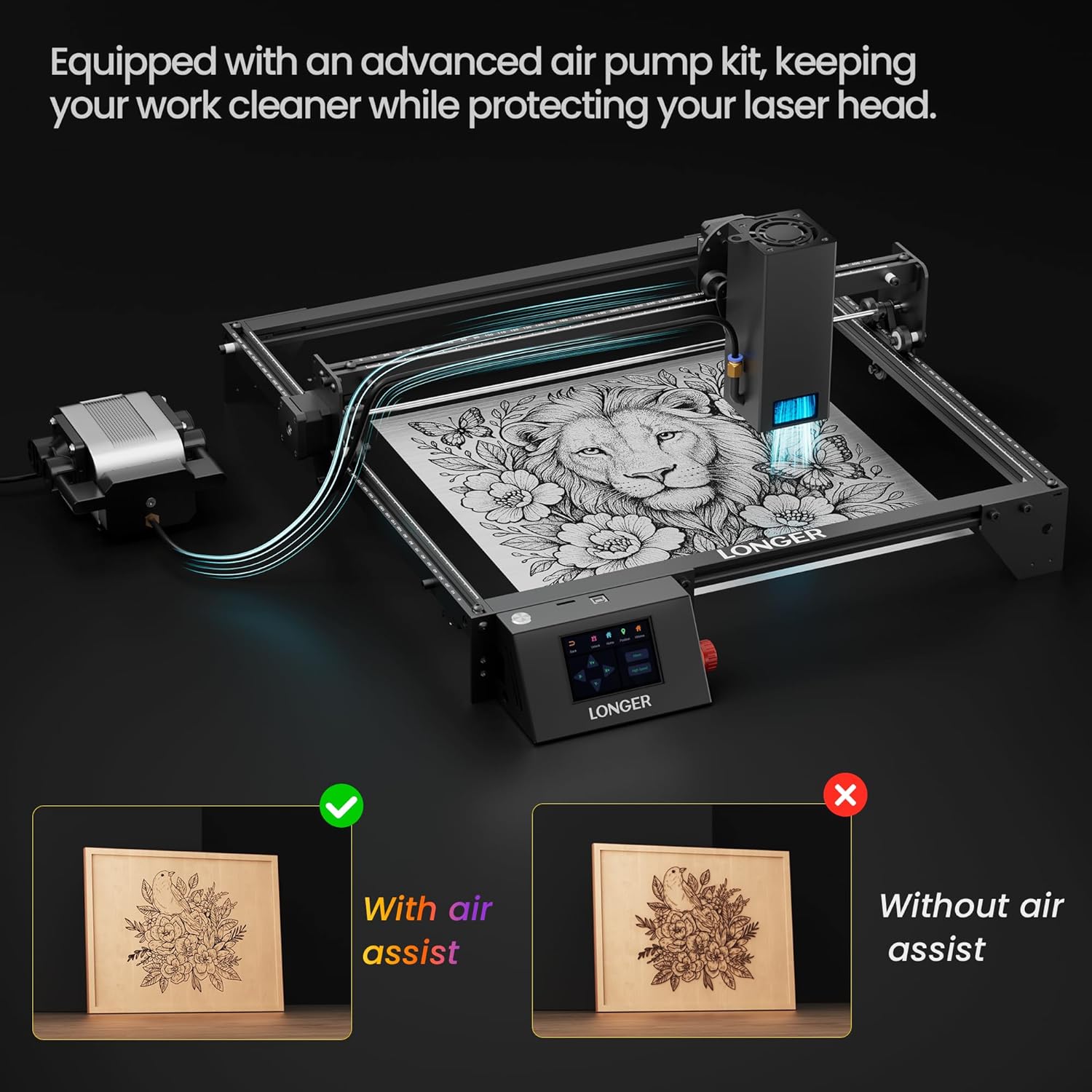 - Accessories for Enhanced Engraving – The rotary attachment enables precise, multi-functional engraving on various cylindrical objects such as glasses, tumblers, and baseball bats. The air pump delivers adjustable airflow from 10-30 L/min to reduce smoke and dust. Strong airflow also cools quickly to prevent over-burning, ensuring cleaner.It's ideal for cutting and engraving 3–6mm thick materials. The set includes 12 risers, each adding 60mm of engraving height.