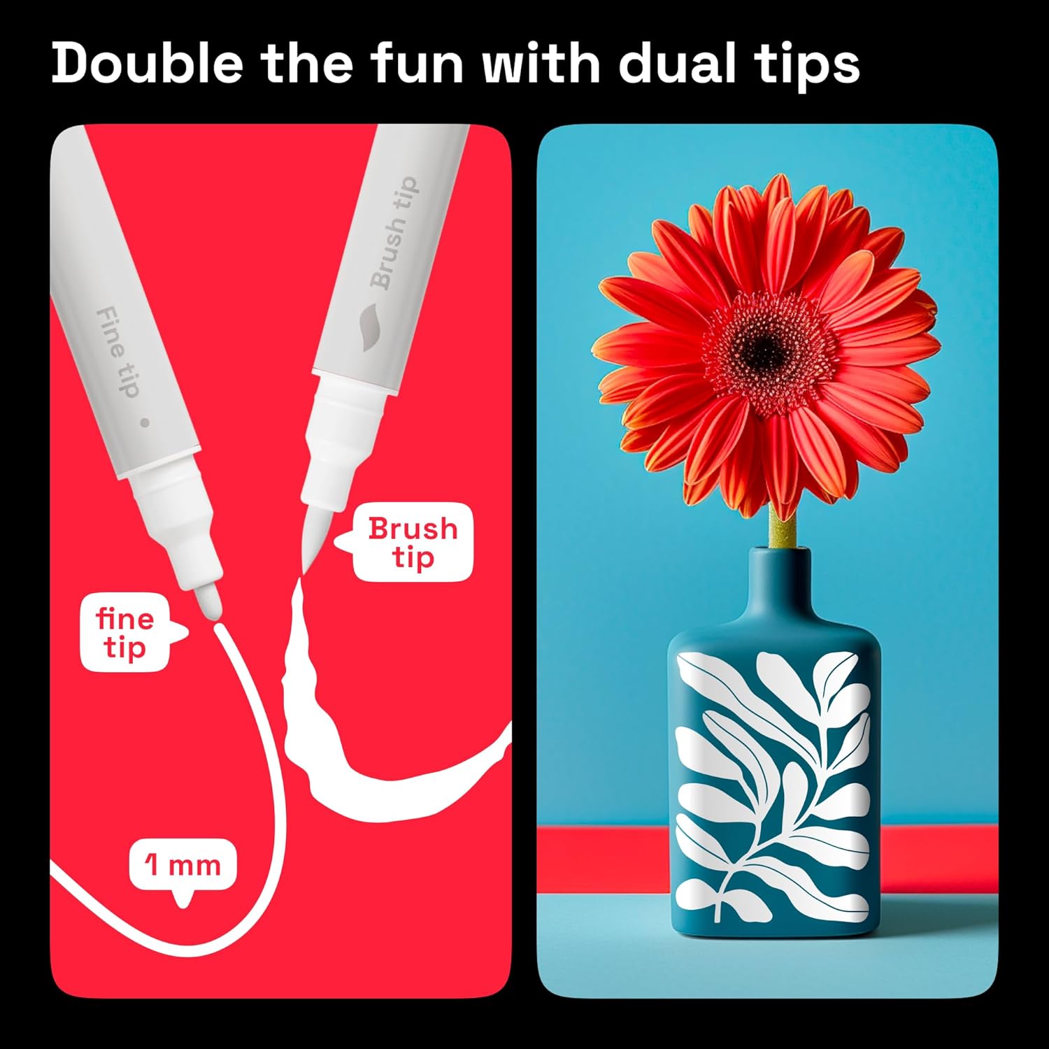 - Dual Tip Design: Each Artistro white acrylic paint marker is equipped with a flexible 1β5 mm brush tip for coloring, shading, and bold strokes, plus a 1 mm fine tip for outlining, lettering, and precise details. Two tips in one pen for maximum versatility.