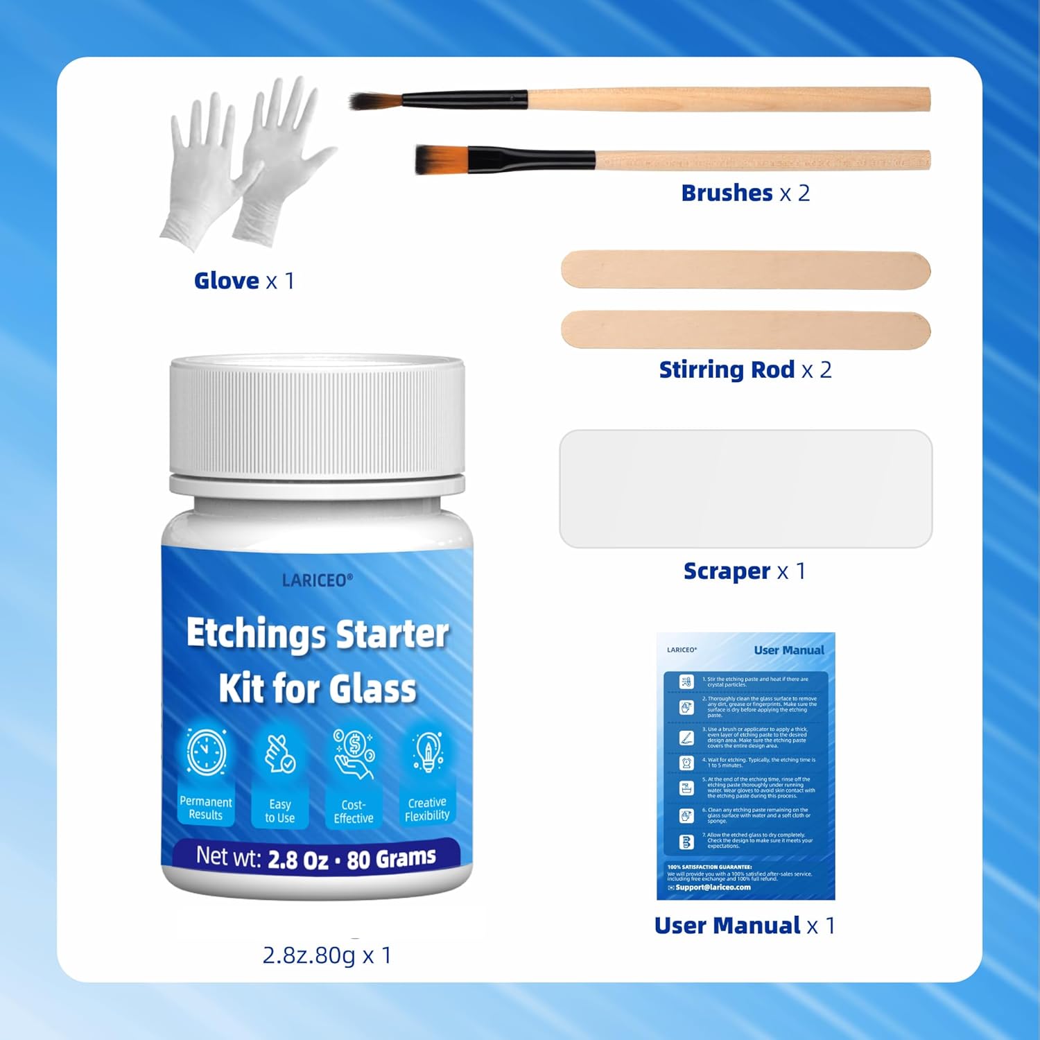 - EASY TO USE: No special tools or skills required! Applying the etching starter kit for glass is a simple process. Just clean your glass surface, apply the glass permanently etched kit using a brush or applicator, wait a few minutes, and rinse it off. Simple application process with clear instructions for outstanding results.