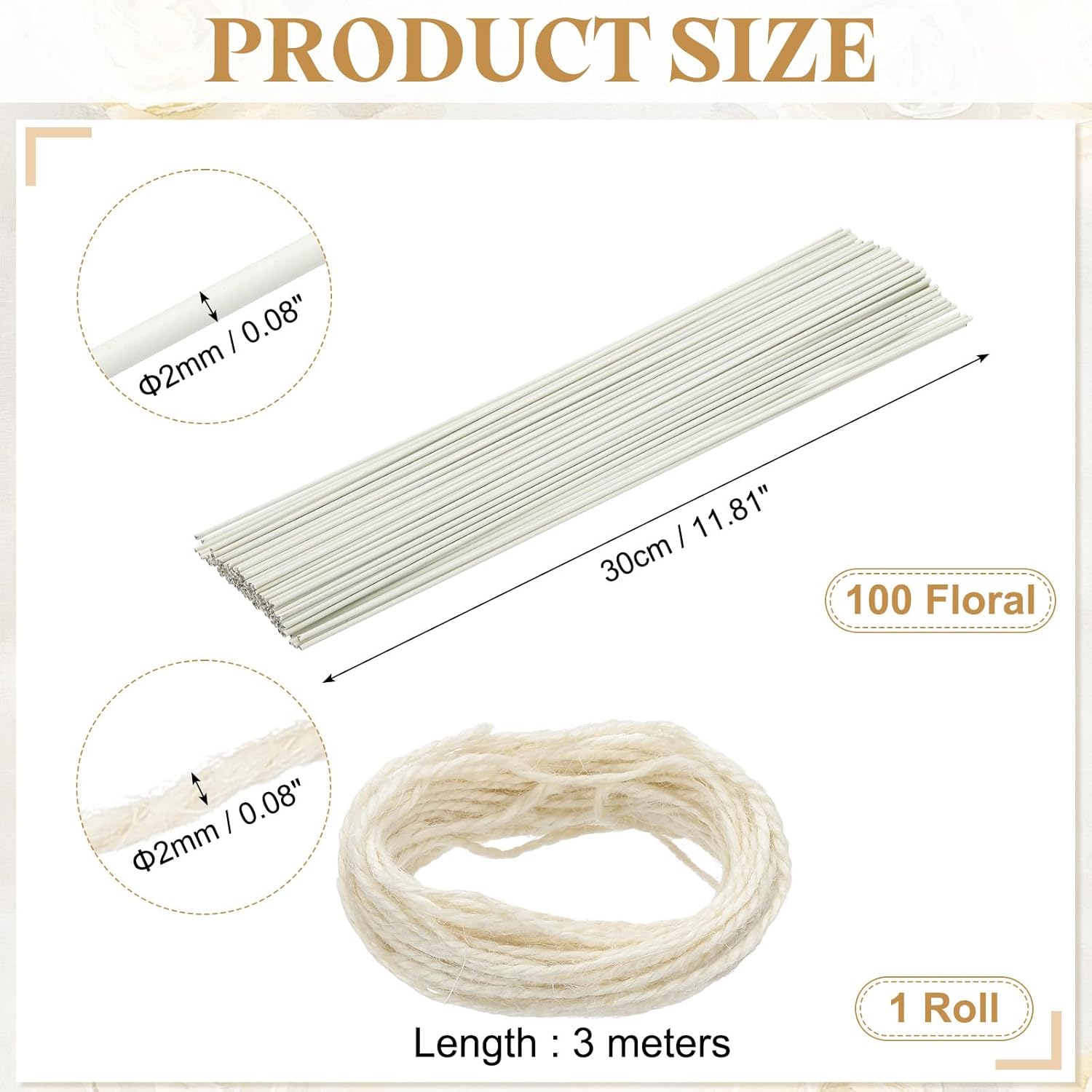 - What You Get: The package includes 100 floral wires and 1 roll of 3 meters long twine. Each floral wire is 2mm/0.08" in diameter and 30cm/11.81" long. The twine is 2mm/0.08" in diameter and has a total length of 3meters/32.8ft, which can meet various creative and gardening needs