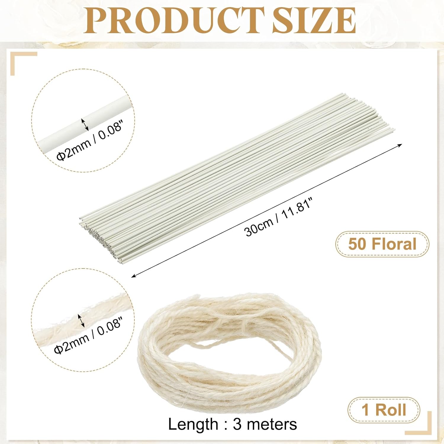 - What You Get: The package includes 50 floral wires and 1 roll of 3 meters long twine. Each floral wire is 2mm/0.08" in diameter and 30cm/11.81" long. The twine is 2mm/0.08" in diameter and has a total length of 3meters/32.8ft, which can meet various creative and gardening needs